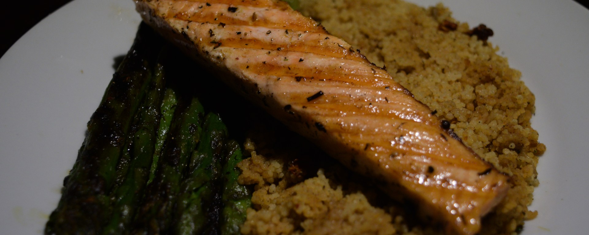 Place your asparagus on the plate next to the cous cous, and add the salmon on top of this. Serve hot and steaming!