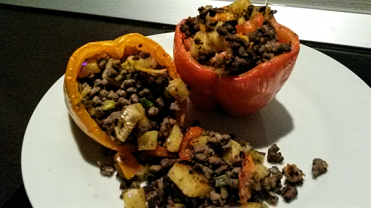 Last time I was at the supermarket, I remembered a recipe I haven’t made in quite some time: (bell) peppers stuffed with potato, onion, garlic and minced beef. Twenty minutes later, my groceries were done and contained all I needed for this lovely dish. Below recipe makes 2 peppers per person.