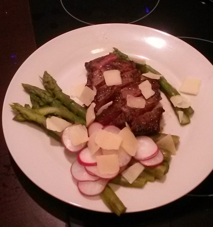 Once cooked as preferred, take out the steak and cut over length in slices of 1.5 – 2cm thick. Place these on the plate. Now take half of your asparagus and slice these lengthwise in half. Place neatly around the steak. Now add on some of the cooking juice of the steak and extra pepper if required. As last, spread over the radish slices and parmesan shavings over your food. Serve straight away while hot!