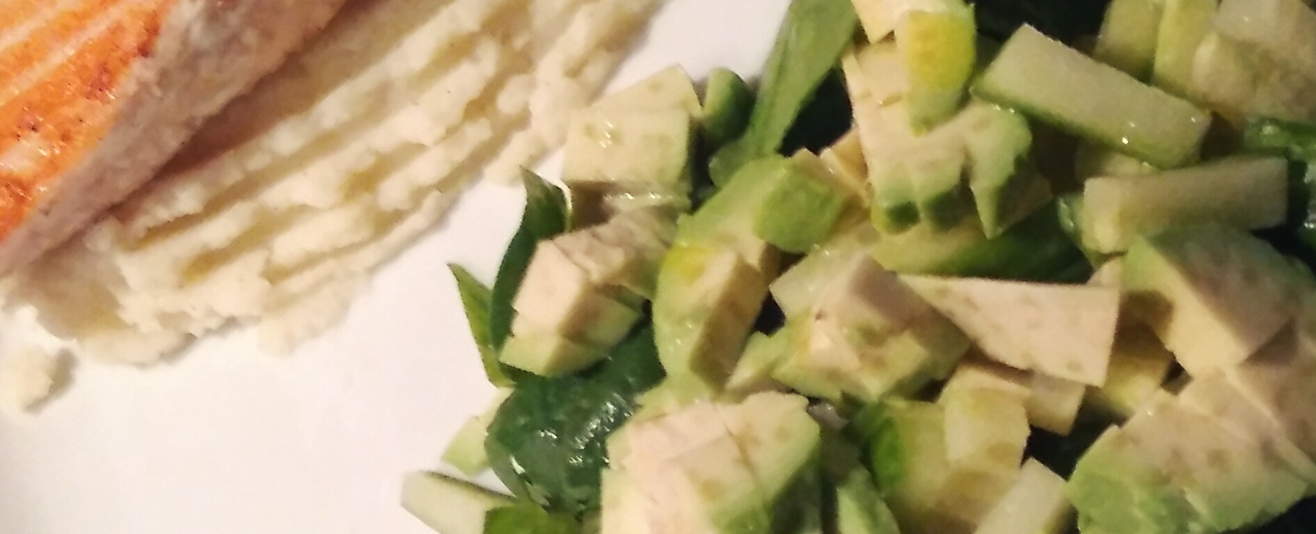 Rinse and peel the 6-8 cm of cucumber, and slice thinly. Then cut the slices into strips and add in the bowl to the other vegetables. Toss carefully as not to mash the avocado, and season with pepper and salt. Also drizzle some olive oil over the salad and squeeze lemon juice out of the lemon. I can’t really say how much juice or olive oil, as this depends on your taste. Toss the salad and place on one side of the plate.