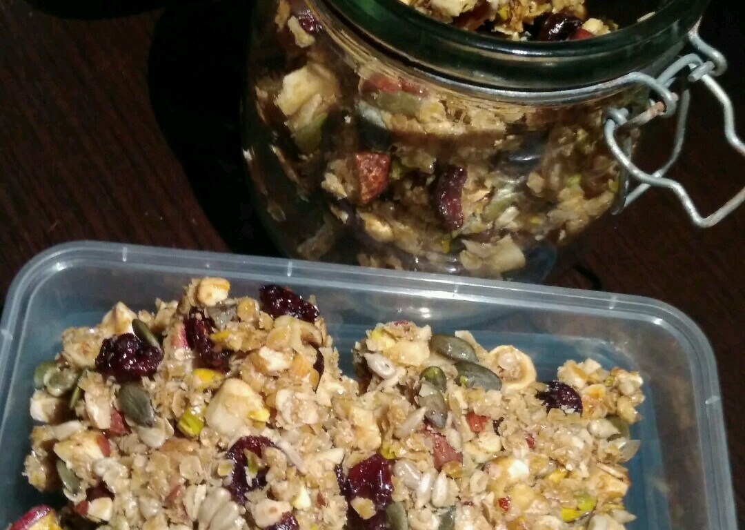 In mean time, measure 2 cups of oat flakes, and poor in a large mixing bowl. Take your 1/2 cup of almonds and crush these. Repeat the same with the cashew nuts, hazelnuts and walnuts. Add to the large mixing bowl. Also add on the sunflower seeds, pumpkin seeds and crushed pistachios. Mix all well and toast in the lined baking tin for 10 -15 min in the oven, stirring occasionally. I promise, this smells great (this is to hide the fact I forgot to take photos of this step… smart me)