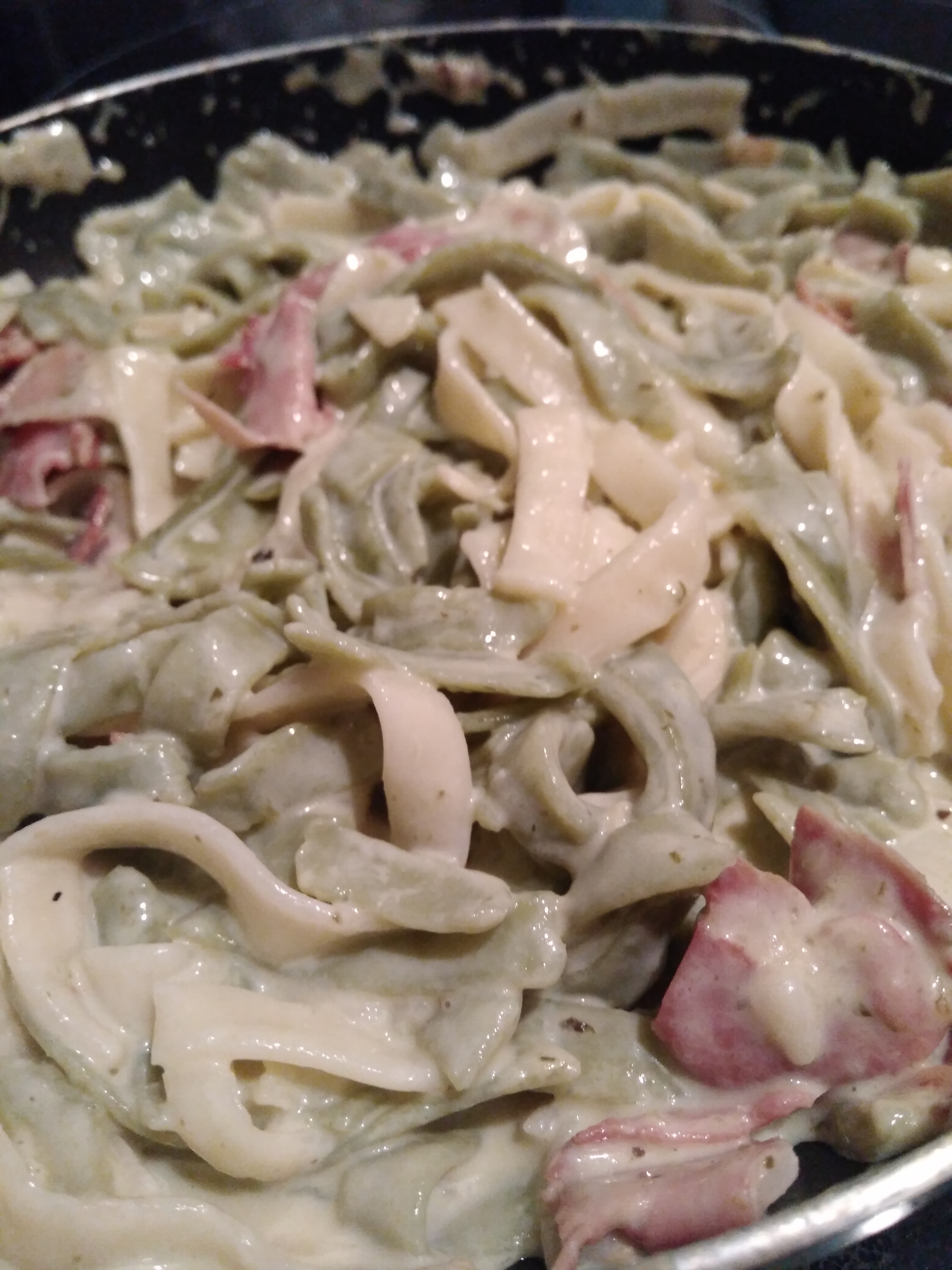 It’s one of these days that my inspiration comes from what is in my fridge and my really rumbling tummy, so todays recipe is a super quick and easy recipe (no surprise there). It takes no time to make (so perfect when your neighbours can hear your tummy grumble loudly!) and definitely no time to eat…. I like the cream that softens the strong basil flavour and balances it with the crisp and saltiness of the parmaham. And pasta…… I just quite like pasta 😁