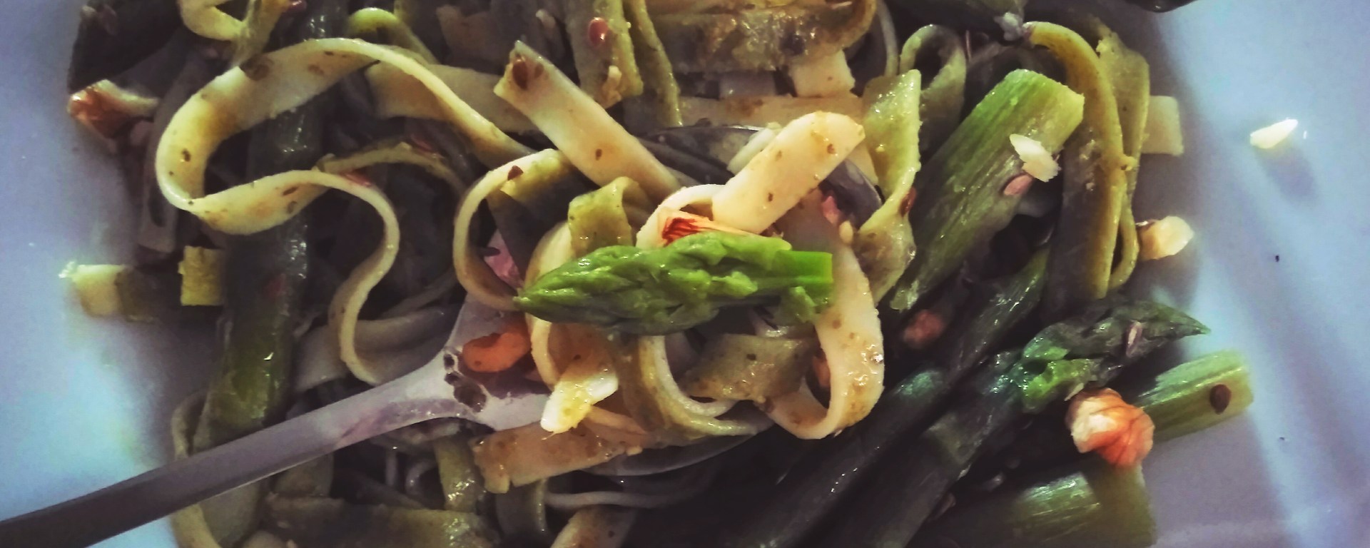 This evening’s dinner is kind of a toss-things-in-a-pot-and-see-what-happens meal, which in all honesty (as I have established already – warm avocado….my tastebuds did not like that one…) can go either bad or good. For the record, this one came out quite nice actually. The crisp taste of the green pesto on the pasta, the slightly stronger taste of the asparagus although nice and soft carefully balanced out by the crunch of added chopped walnuts.