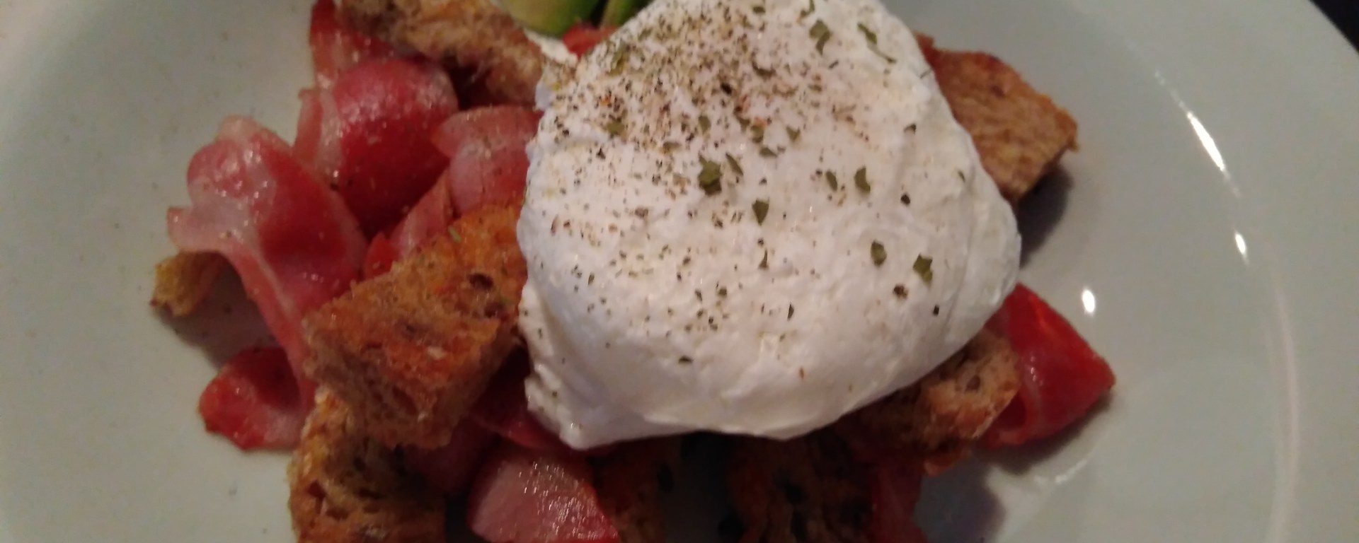 Today’s version is made with a poached egg rather than soft boiled, and with bread sticks wrapped and baked with the bacon around it.