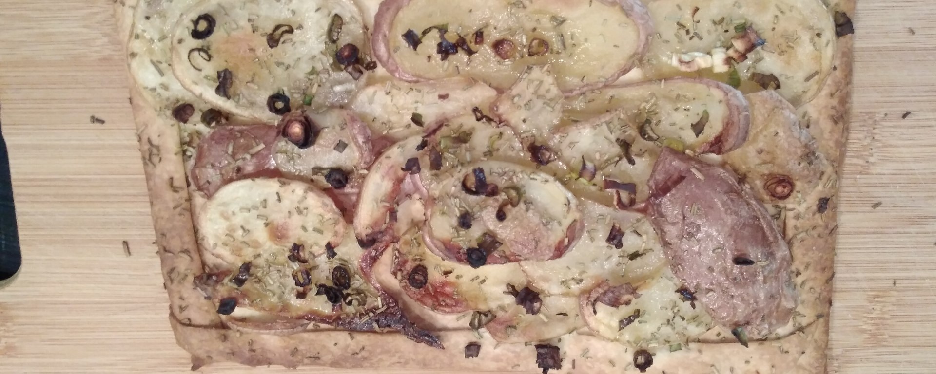 Sprinkle a bit of olive oil and pepper and salt on the pastry. Place a mix of potato sliceson here. I would keep the small ones for the top, because these will curl whilst cooking. After the first layer of potato, add more oil, peppers salt. Repeat with a second layer and season well. Once the last layer is on, also season with herbs at taste, I used rosemary last time but have used herbes provençales or Tarragon before.