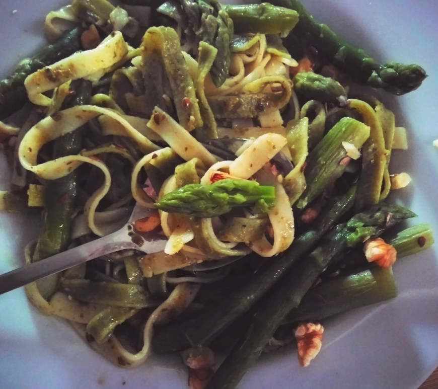 The crisp taste of the green pesto on the pasta, the slightly stronger taste of the asparagus although nice and soft carefully balanced out by the crunch of added chopped walnuts.